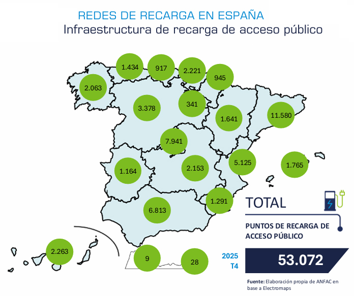 La infraestructura de recarga de acceso público en España cierra 2025 con un aumento del 37%, hasta llegar a los 53.072 puntos, según los datos del último Barómetro de Electromovilidad elaborado por la Asociación Española de Fabricantes de Automóviles y Camiones (Anfac), con datos hasta el 31 de diciembre pasado.